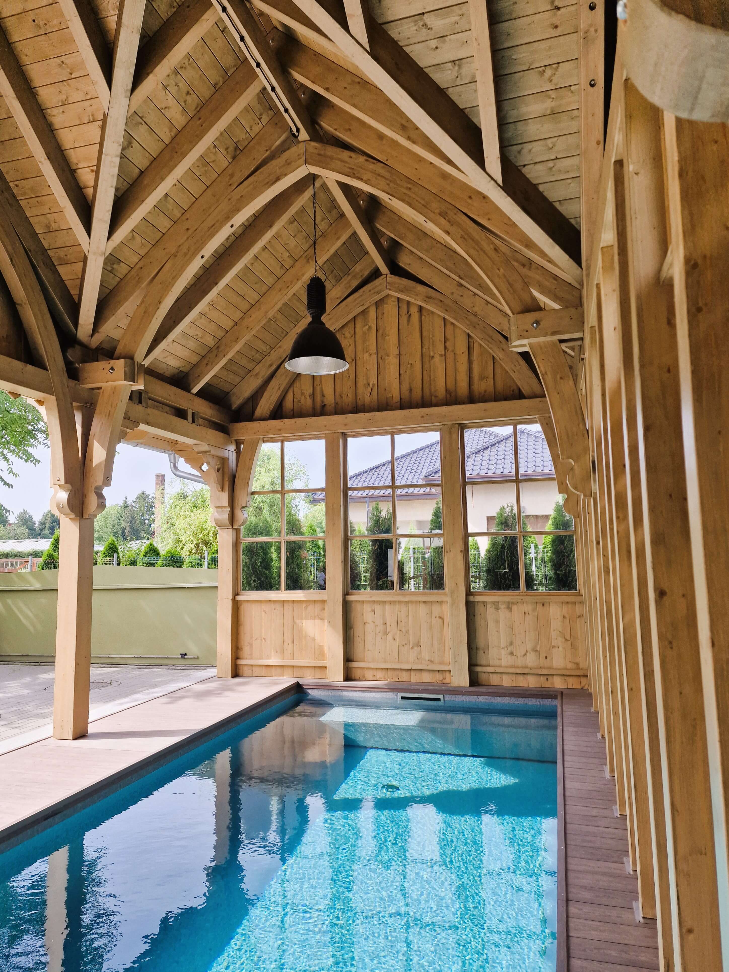 Wiata basenowa zbudowana z drewna KVH i BSH w klasie wytrzymałości C24. Przekroje BSH zostały...
